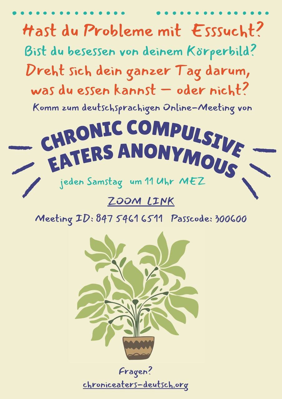 Während der ersten Hälfte teilt die moderierende Person über die Grundlagen des 12-Schritte-Programms und in der zweiten Hälfte studieren wir gemeinsam die Literatur. Zusätzlich gibt es Zeit für Fragen und für den Austausch von Nummern zwischen Neulingen und Sponsoren.
